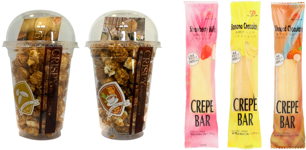 セブンズの商品は大きく分けて2つあります。ポップコーンとクレープ関連商品です。ポップコーンは全てキャラメルをベースとした各種フレーバーでコーティングした高級志向の商品ですが、この3月下旬よりクレープライン増強のため、埼玉工場へ移管します。クレープは特許を取得した製法で三角コーン状のものを作り、アイスやクリームをトッピングし、そのまま食べられるタイプと砂糖をふりかけ、バーナーで炙って仕上げるブリュレタイプがあります。
