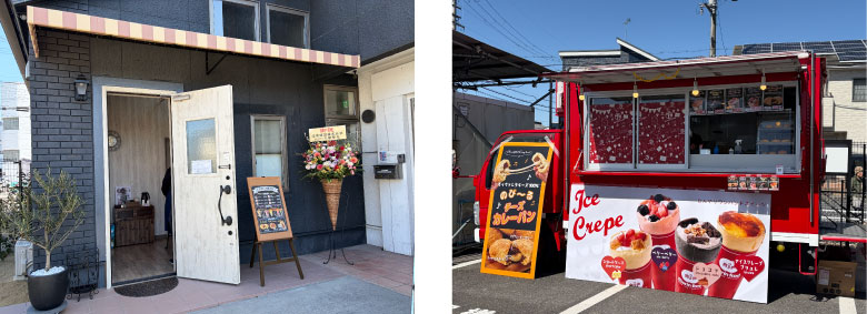野洲事業所のクレープカフェ(左)とセール当日のキッチンカー(右)の様子
